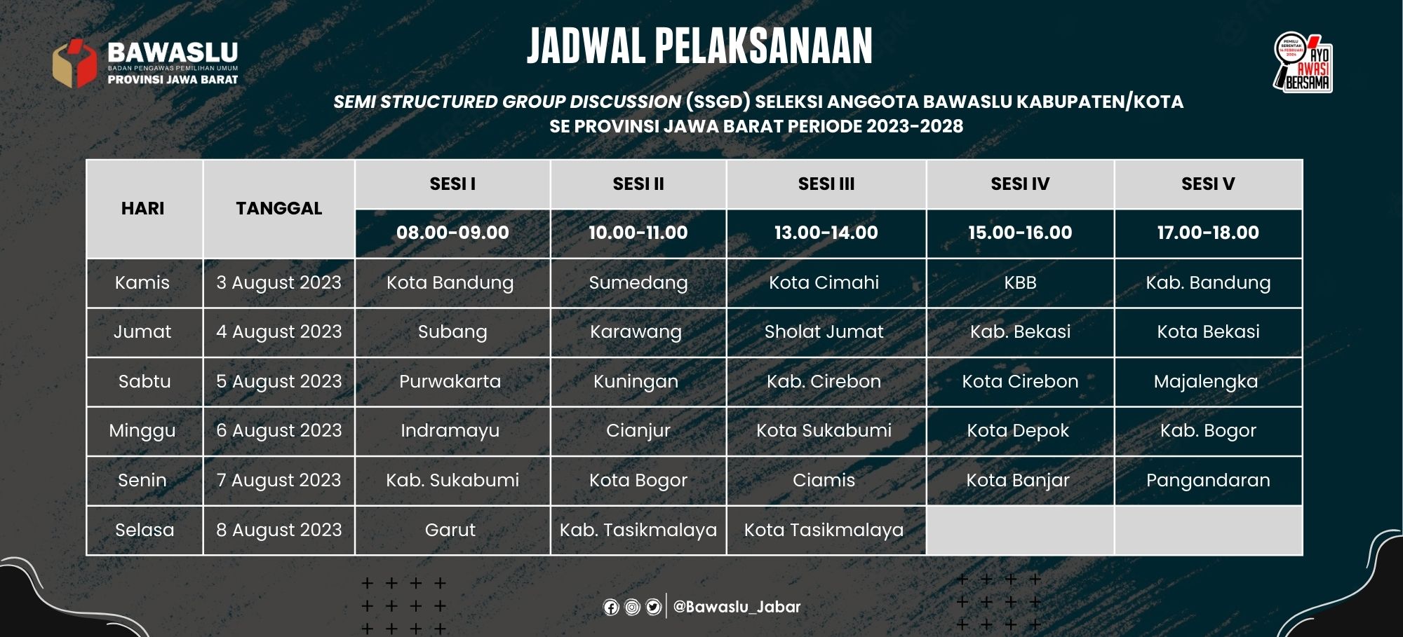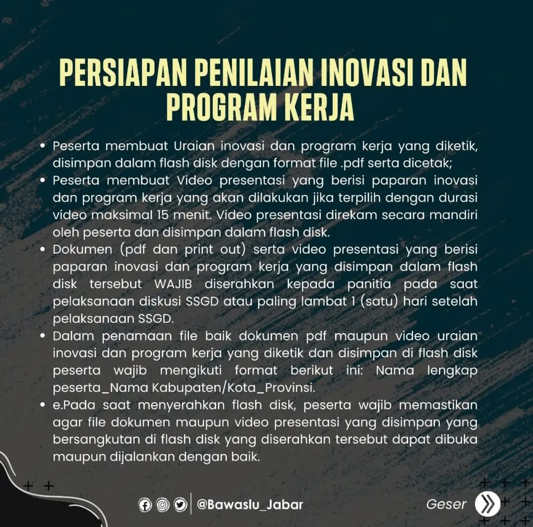 Untuk informasi lebih lanjut mengenai tata tertib uji kelayakan bagi calon anggota Bawaslu Kabupaten/Kota di Wilayah Jawa Barat, silakan unduh berkas pengumuman dibawah ini.