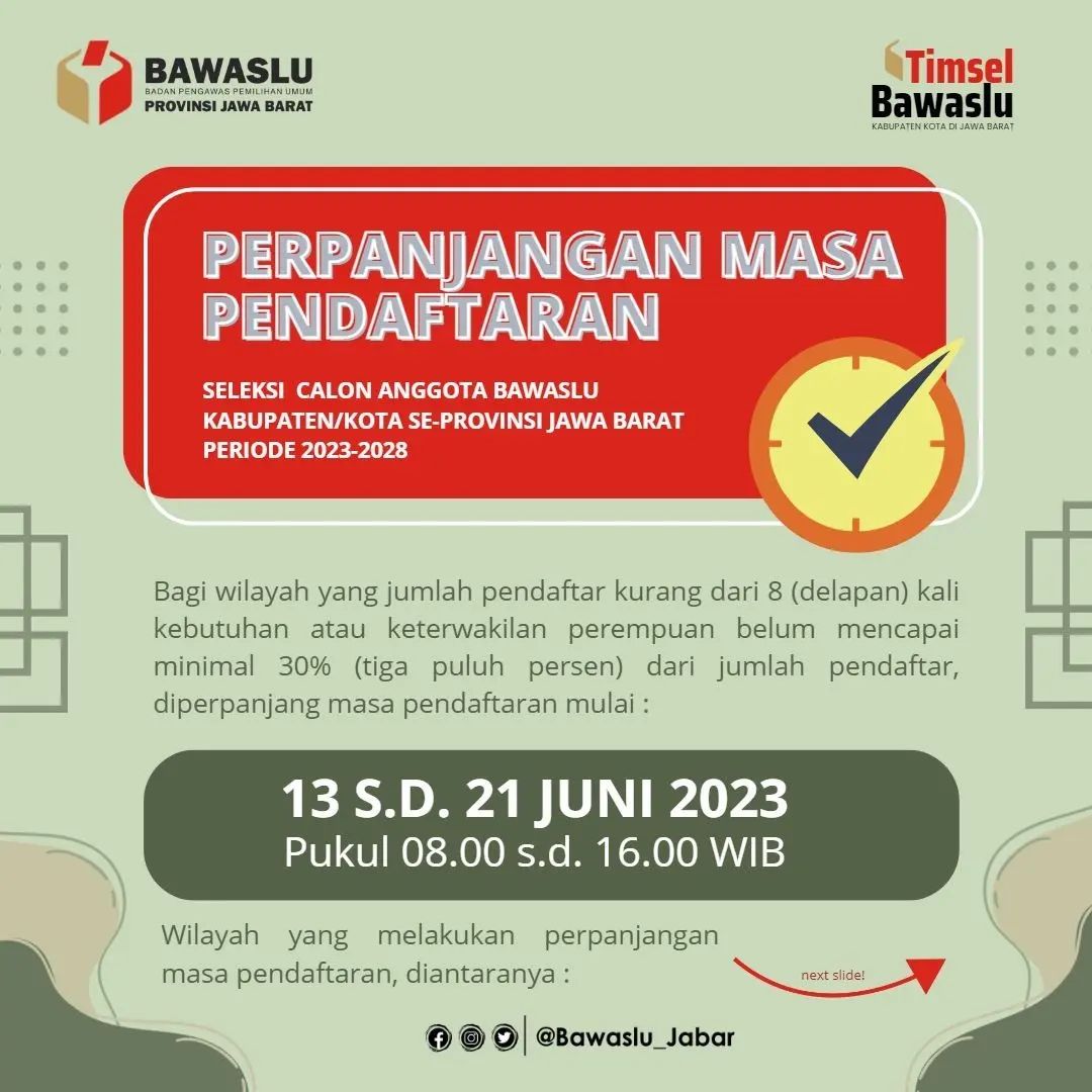 Berdasarkan Keputusan Ketua Bawaslu Nomor 173/KP.01/K1/05/2023 tentang Pedoman Pelaksanaan Pembentukan Bawaslu/Panwaslih Kabupaten/Kota Masa Jabatan 2023-2028, terdapat ketentuan untuk dilakukan perpanjangan masa pendaftaran terkait jumlah pendaftar kurang dari 8 (delapan) kali kebutuhan atau keterwakilan perempuan belum mencapai minimal 30% (tiga puluh persen) dari jumlah pendaftar dan setelah mempertimbangkan hasil Tahapan Penerimaan Pendaftaran Bakal Calon Anggota Bawaslu Kabupaten/Kota Wilayah Provinsi Jawa Barat, tanggal 29 Mei s.d. 7 Juni 2023, maka Tim Seleksi Calon Anggota Bawaslu Wilayah Provinsi Jawa Barat untuk memperpanjang masa pendaftaran paling lama 7 (tujuh) hari kerja yang dimulai pada tanggal 13 s.d 21 Juni 2023, sebagai berikut: